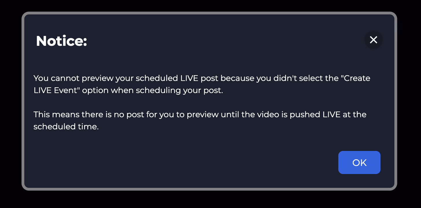 If you are unable to preview your Facebook LIVE and this notice comes up, it's likely because you did not set up your scheduled post to show up on Facebook before it goes LIVE. This article will inform you on how to preview your Facebook LIVE.